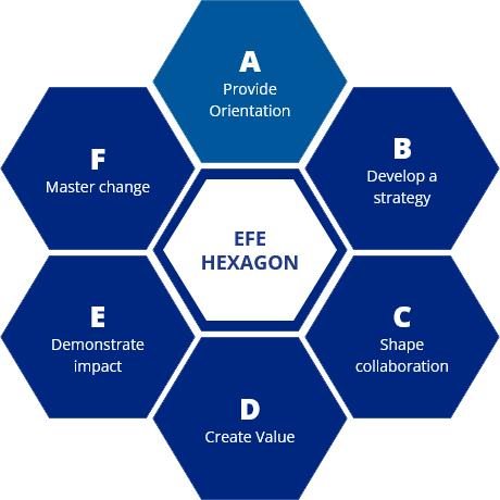 The Excellence Framework Europe hexagon forms the heart of the framework. It describes the content and fields of action that excellent organizations consistently implement in order to clearly stand out from the crowd.