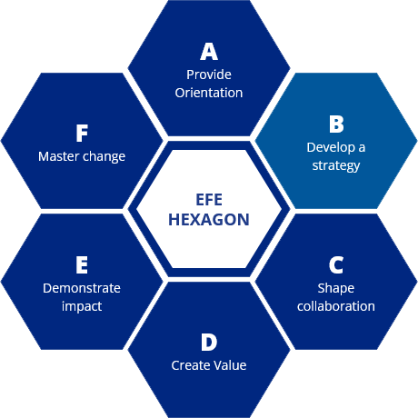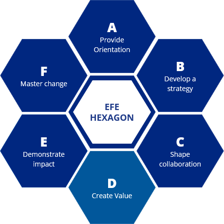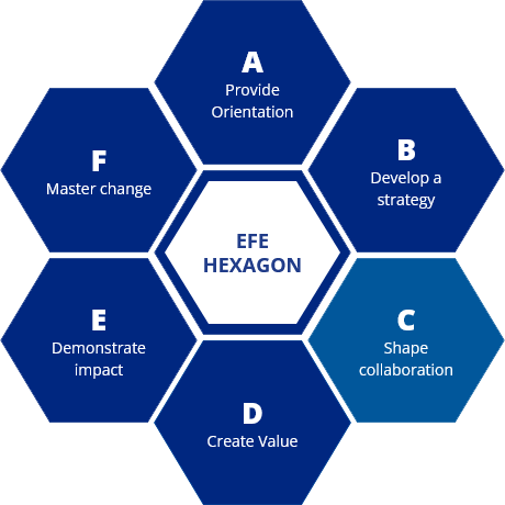 The Excellence Framework Europe hexagon forms the heart of the framework. It describes the content and fields of action that excellent organizations consistently implement in order to clearly stand out from the crowd.